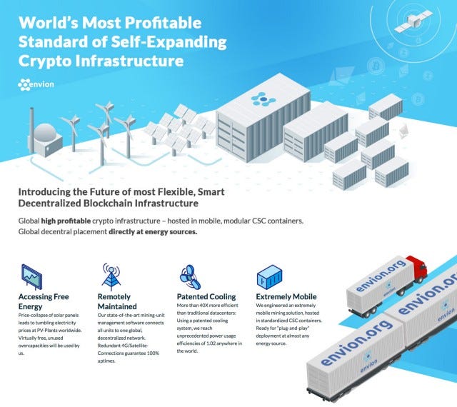 PROPOSISI PENJUALAN UNIK Envion telah mengembangkan unit pertambangan bergerak yang sepenuhnya otomatis ("industri 4.0") di dalamnya Wadah intermodal bersertifikasi CSC yang dapat dikirim ke lokasi manapun dunia dalam beberapa hari (kebanyakan rute transportasi) atau minggu (transportasi antar benua). Harga terendah untuk energi di pasaran. Unit penambangan kami menggunakan energi hijau dengan harga rendah langsung di sumber - dekat pantai, di padang pasir atau di lokasi terpencil lainnya. Ini memungkinkan kita untuk selalu menempatkan Unit Mobile Minings (MMUs) secara strategis di daerah dengan pasokan energi yang kompetitif dan memberi kita pengaruh saat bernegosiasi dengan penyedia energi. Efisiensi energi maksimal. Teknologi pendinginan mutakhir. Kami telah merancang, mengembangkan dan menguji secara radikal baru, sistem pendingin self-regulating yang dirancang khusus untuk pertambangan blockchain industri. Sistem pendinginan yang menunggu paten ini mencapai efisiensi energi terbaik di kelasnya dengan konsumsi hanya ~ 1% dari total konsumsi energi sistem. Skalabilitas yang sebenarnya. Produksi massal & skalabilitas telah tertanam kuat ke dalam envion’s DNA dari hari pertama. Di samping komponen khusus yang dikembangkan oleh envion (misalnya rangkaian papan untuk sistem manajemen atau pendinginan), Unit Pertambangan Seluler kami menggunakan berbagai macam komponen standar yang memudahkan produksi massal. Investasi kami di Perangkat lunak adalah menjaga lintasan pertumbuhan kita dengan menyediakan sarana yang diperlukan mengoperasikan armada MMU yang besar. Melalui jaringan perusahaan mitra kami, kami telah melakukannya mampu mengamankan akses yang diprioritaskan ke komponen seperti GPU dalam jumlah banyak. Mitigasi risiko dengan desain. Envion mampu "menambang" set yang luas kripto darurat, unit pertambangan bergerak kita juga mengurangi konsentrasi kekuatan ini sebagai ketergantungan pada satu pemerintahan (misalnya perubahan peraturan), energi tunggal penyedia (mis., kekurangan energi atau kenaikan harga yang cepat) dan kripto daya tunggal (misalnya terjadi benturan kripto). Mendukung smart grid. Unit pertambangan bergerak kami dirancang dan dibangun untuk beroperasi pada15 lokasi terpencil ("industri 4.0") di dekat sumber energi seperti pembangkit tenaga surya, turbin angin atau pembangkit listrik tenaga air. Unit penambangan mobile kami dapat diintegrasikan ke dalam smart grid dan Secara fleksibel mengambil beban dari jaringan energi. Parameter penting untuk cryptomining adalah harga listrik, dimana ganjaran dan Depresiasi perangkat keras serupa untuk setiap pelaku pasar. Bagi penambang komersial, biaya infrastruktur data center sama pentingnya. Kami di envion telah dibahas Kedua pembalap biaya dengan konsep kami Mobile Mobile Unit: itu adalah modular, sederhana, kuat dan sangat hemat biaya untuk operasi data center dengan fleksibilitas dan ukuran standar yang dibutuhkan untuk strategi penyebaran global.